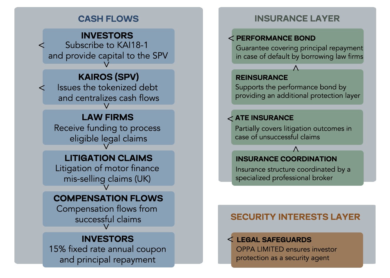 After investors subscribe to KAI18-1 tokens, the capital raised flows through the SPV (Kairos) and is used to issue loans to law firms. These firms then finance the progression of legal claims. Compensation from successful cases ultimately feeds the SPV’s cash flows, enabling it to repay principal to investors and pay interest on the notes.