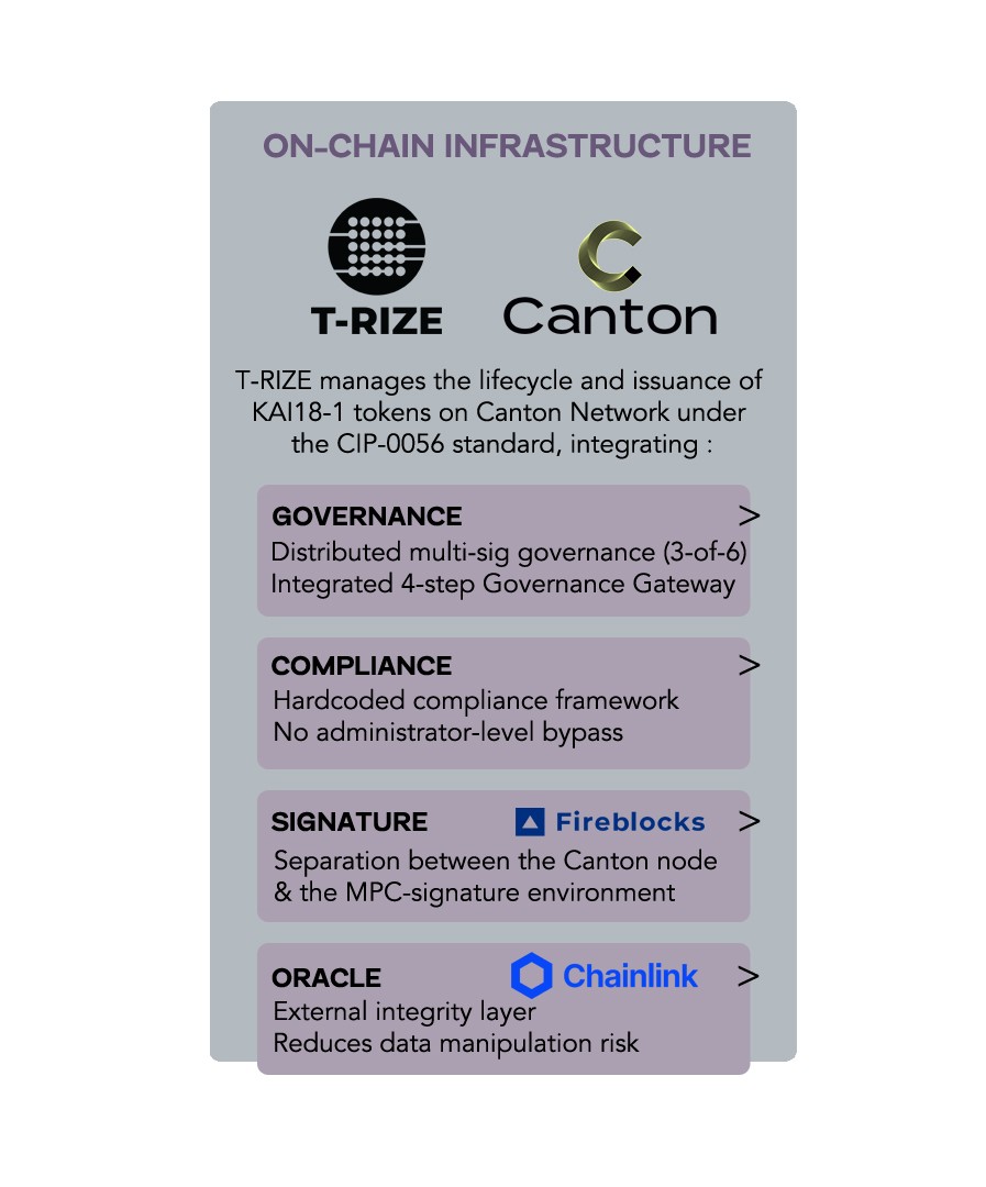 The on-chain technology layer, T-RIZE Group & Canton Network:T-RIZE handles the digital layer: creation of the KAI18-1 token, onboarding, position recording, transfer rules, governance, and lifecycle. The token is deployed on a permissioned institutional network, the Canton Network, launched in May 2023 by a consortium including Goldman Sachs, BNP Paribas, Deutsche Börse, Cboe, Deloitte, Capgemini, Microsoft, and among others, Digital Asset, which counts strategic investors such as BNY Mellon, Nasdaq, S&P Global, HSBC, and iCapital. T-RIZE Group deploys on Canton Network two applications, including one dedicated to real-world asset tokenization.