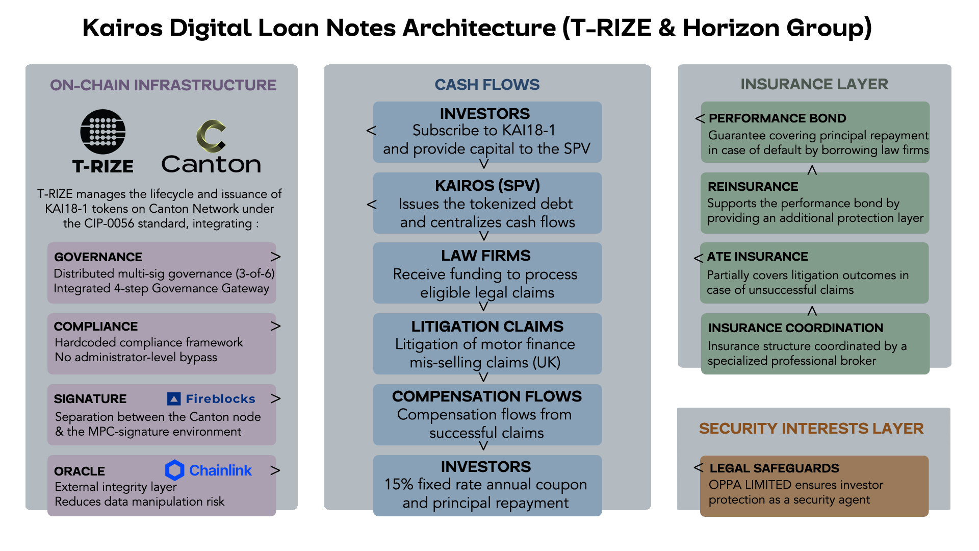 The investor therefore purchases, on-chain via Canton Network, a tokenized debt claim on an SPV, repaid through compensation flows from litigation claims, with legal, insurance, and on-chain protection layers. T-RIZE provides the tokenization engine, access control, governance, and digital administration that allow the KAI18-1 security token to properly exist on Canton Network with a B+ rating assigned by Particula.